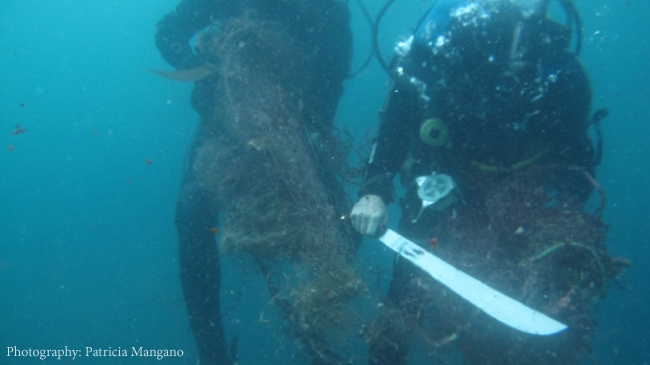 Ben Harris removes hundreds of meters of fishing net from La Ballena ,Contreras.